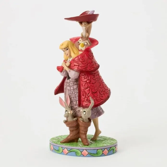 Aurora's forest friends transform into a man in a red coat as she searches for her prince. An owl, squirrel, and bunnies inside boots add charm to this captivating Jim Shore design, bringing the memorable movie scene to life with enchantment.