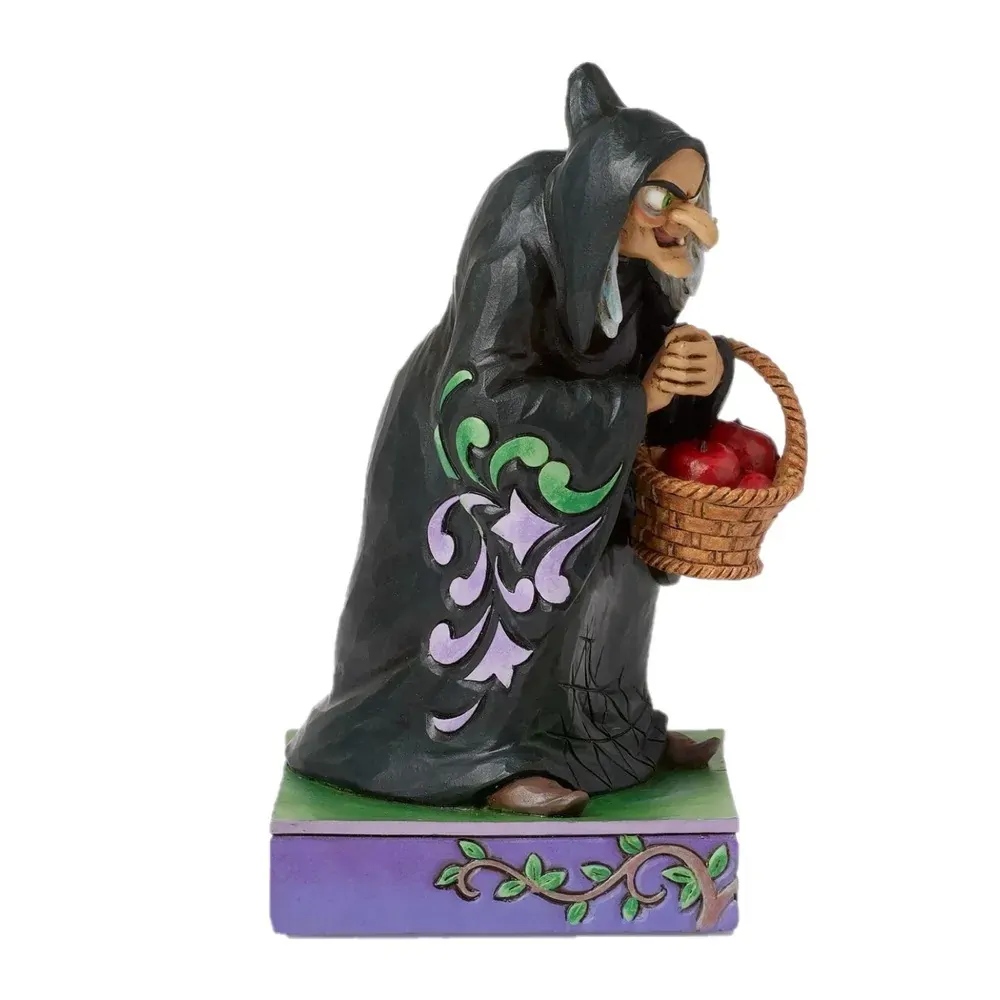 In a sinister guise, the evil witch lurks in the shadows as an elderly woman, her black cloak adorned with vibrant Jim Shore rosemaling, as she carries a basket brimming with poison apples. Her intentions drip with malice and deceit.