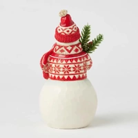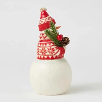 This cheerful Jim Shore Nordic Noel snowman is dressed in an intricately patterned red Nordic sweater, scarf, and hat, radiating warmth and holiday spirit. With a bright smile, he holds a fresh evergreen sprig in his hands, eagerly embracing the joys of Christmas.