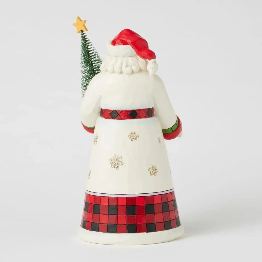This charming Jim Shore design features Santa holding a decorated sisal tree, dressed in a cozy buffalo plaid cloak that embodies holiday warmth. His gown, adorned with snowflakes and a dashing reindeer silhouette, captures the spirit of the season.