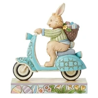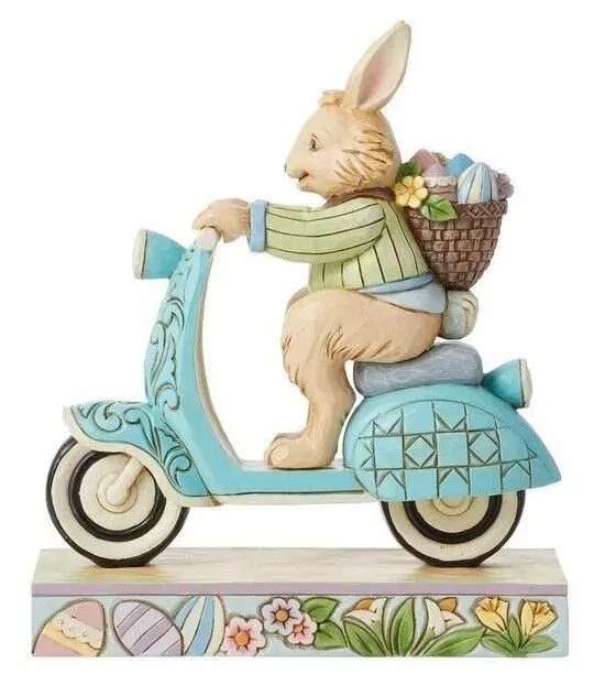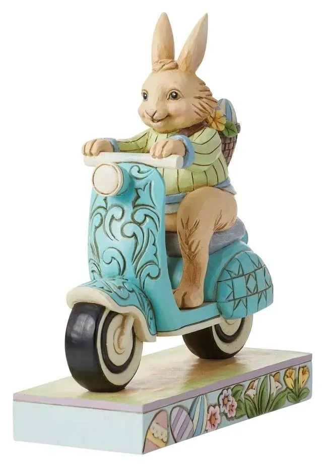 On a mission to deliver painted eggs and freshly picked flowers, this Easter bunny hops on a blue scooter decorated with rosemaling touches to be fancy while speeding by. Wearing a green jacket and smile, this figurine by Jim Shore adds fun flair.