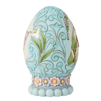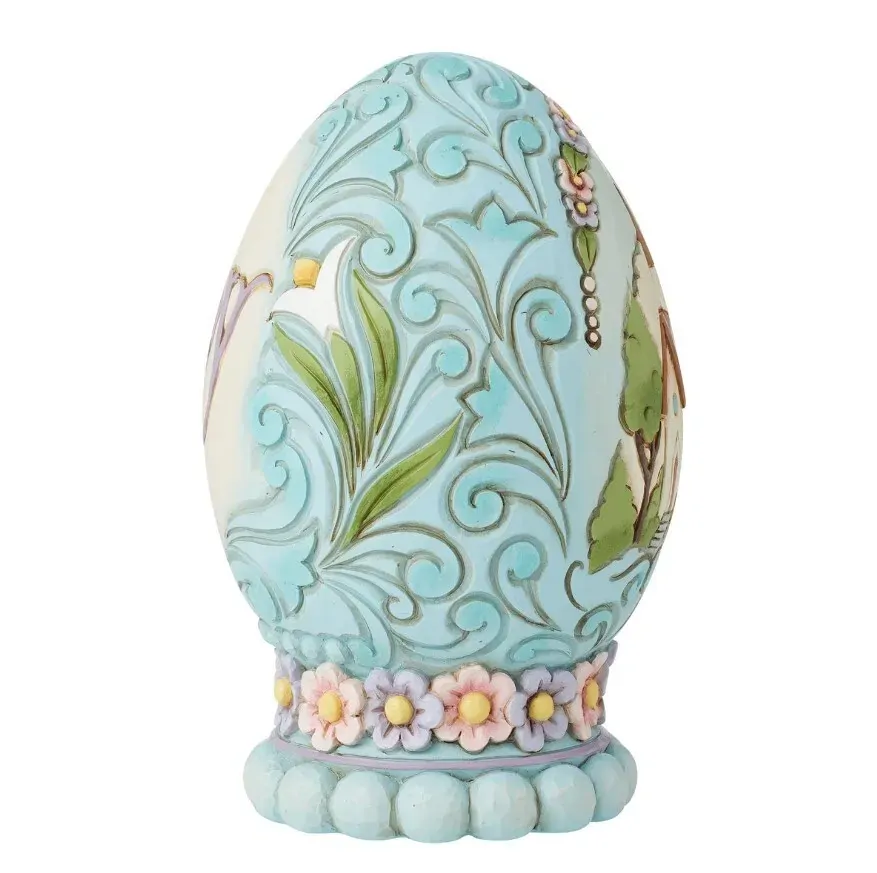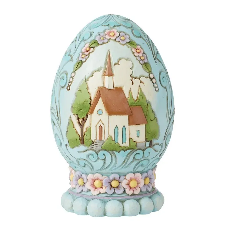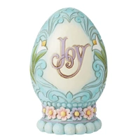 Framed inside an intricately adorned Easter egg, Jim Shore places a serene church amidst a haven of fresh flowers and the word Joy. Inspire quiet contemplation and embrace the serenity of this Spring's spiritual blessings.