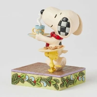 Spread holiday cheer with this delightful Jim Shore design of Snoopy and Woodstock preparing a festive treat for Santa. Snoopy carries a glass of warm milk, while Woodstock balances a plate of fresh Christmas cookies atop his head.