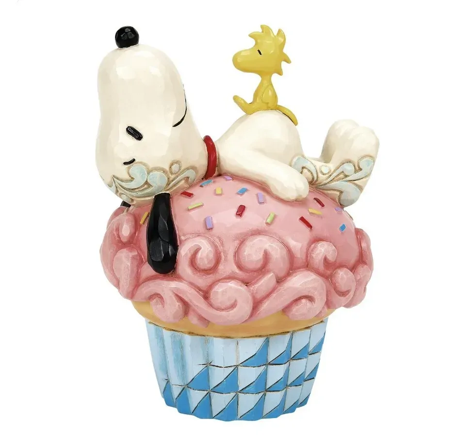 In Jim Shore's charming design, Snoopy takes a cozy nap atop a large, sprinkled pink cupcake, complete with intricate rosemaling details and tempting icing. Adding to the sweetness, Woodstock joins the slumber party on top of Snoopy.