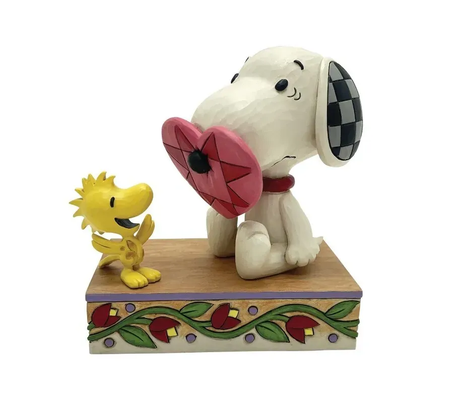 This sweet Jim Shore creation depicts Snoopy with his nose piercing a patchwork heart, while Woodstock giggles beside him. Set upon a stage adorned with intricate floral patterns, it captures the endearing bond between the beloved Peanuts characters.