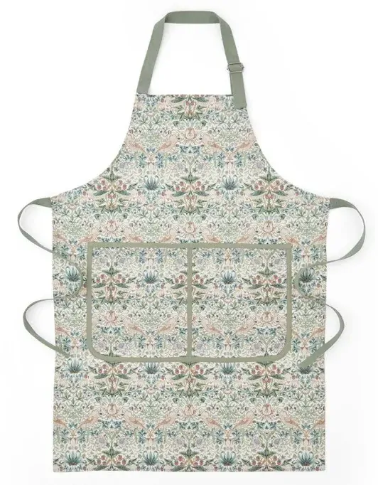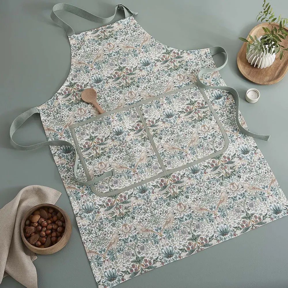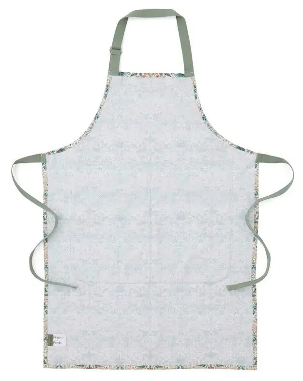 Add a touch of iconic design to your kitchen with this Morris & Co. Strawberry Thief Apron. Made from 100% cotton, this apron features the captivating Strawberry Thief pattern in soft green and pink shades. The detailed design covers the entire apron, including the practical deep front pocket, and is beautifully complemented by green waist and neck ties. Ideal for protecting your clothes while in the kitchen or garden, its generous size provides full coverage, ensuring you stay clean and comfortable.