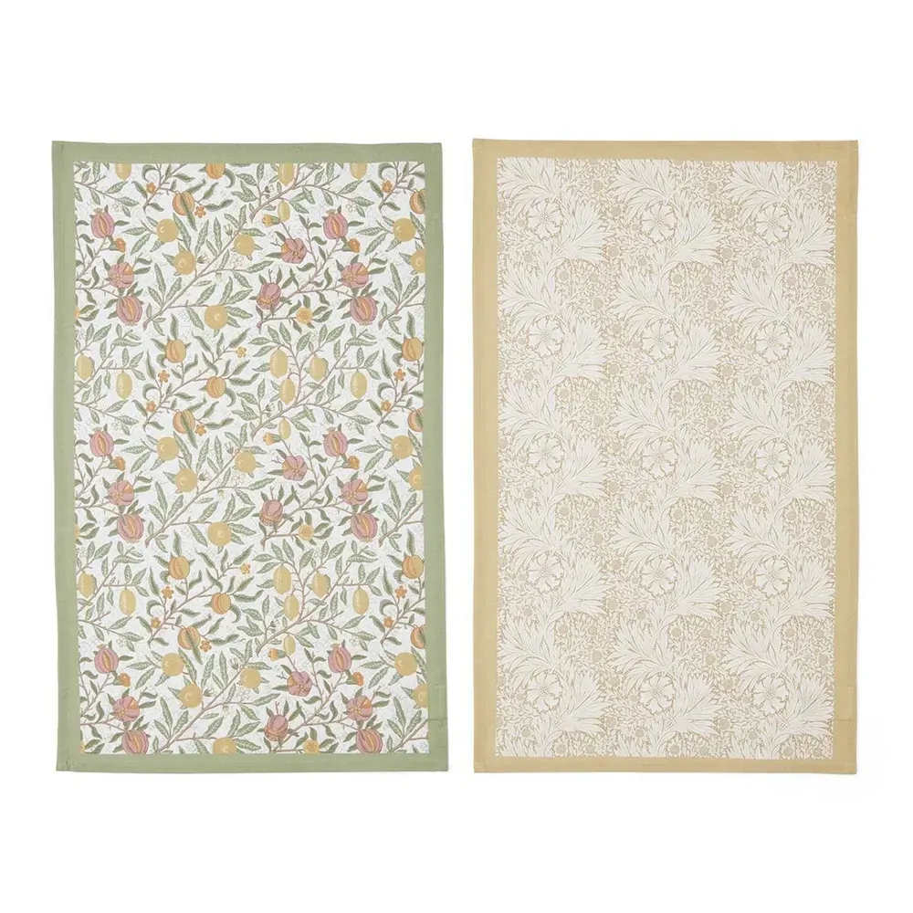Bring timeless style to your kitchen with this set of 2 Tea Towels from Morris & Co. Crafted from 100% cotton, these towels combine practicality with iconic design. One towel features the vibrant Fruit design, a classic William Morris pattern from 1864, framed by a cheerful yellow border, while the other towel showcases the serene Marigold design, a tranquil monotone pattern, presented in a soft yellow hue with a contrasting green border. The soft, absorbent cotton ensures effective drying, while the iconic designs add a touch of elegance to your daily routine.