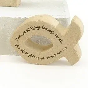 A beautiful stone resin plaque in the shape of the ichthys symbol, with a Bible verse on the front.