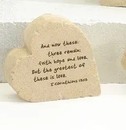A beautiful stone resin plaque in the shape of a heart laying on it's side, with a Bible verse on the front.