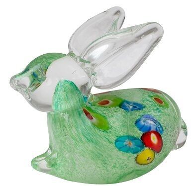A beautiful coloured glass ornament from Whitehill's Russell Collection. Ornament is a rabbit in shades of green with colourful flowers visible inside.