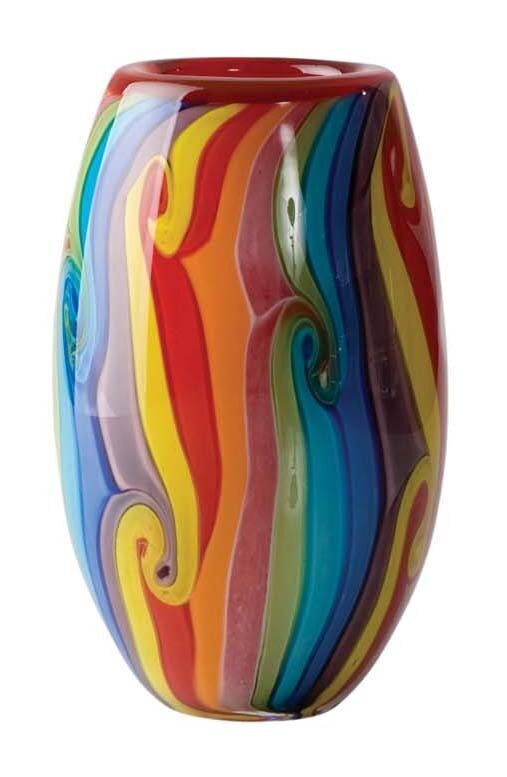 A beautiful coloured glass vase from Whitehill's Russell Collection. Vase is done in swirl patterns in all the colours of the rainbow.