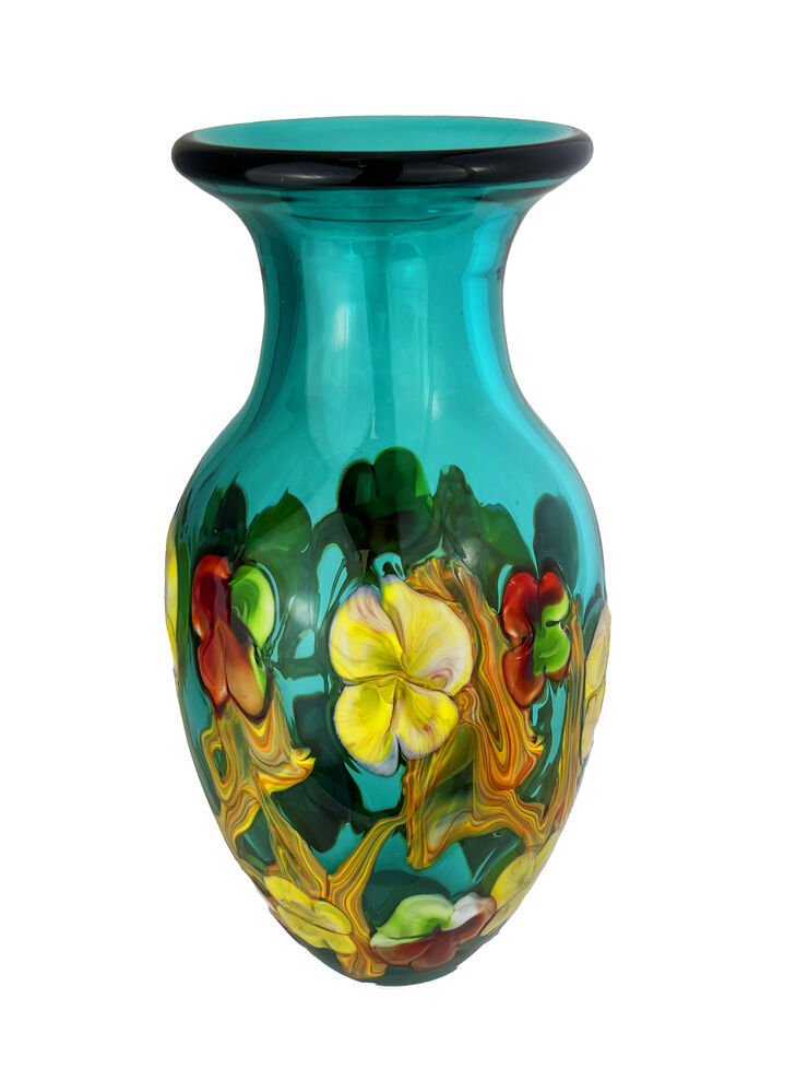 A beautiful coloured glass vase from Whitehill's Russell Collection. Vase is done in a sea green-blue shade with a floral motif overlay around the lower half.