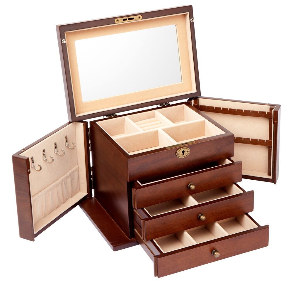 A box with a hinged lid and four levels plus hinged doors on each side, with a walnut veneer in a matte finish. Inside is beige backing, and features shaped perfectly for jewellery such as necklaces, rings and more. There is also a rectangular mirror on the inside of the lid.