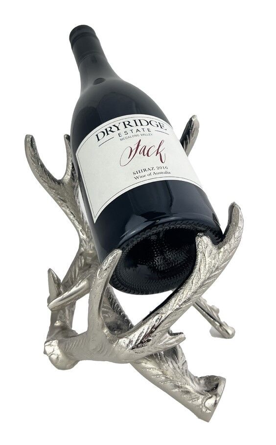 A bottle holder in the shape of an antler with a silver finish.