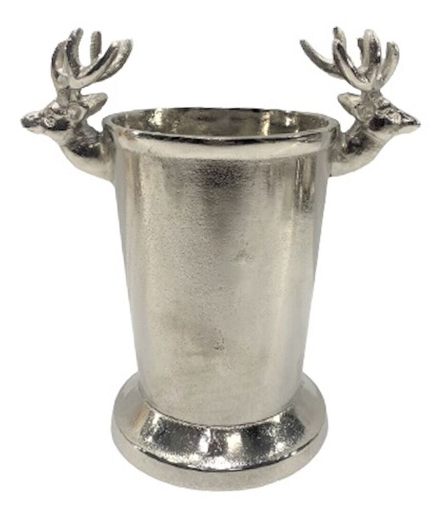A standing bottle holder in a silver finish with a deer head on either side.