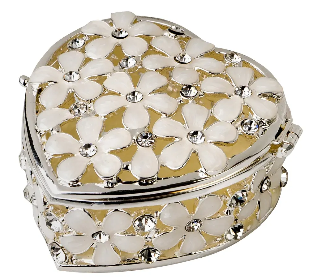 A hinged heart-shaped trinket box made of epoxy decorated with cream-coloured daisies with diamante middles.