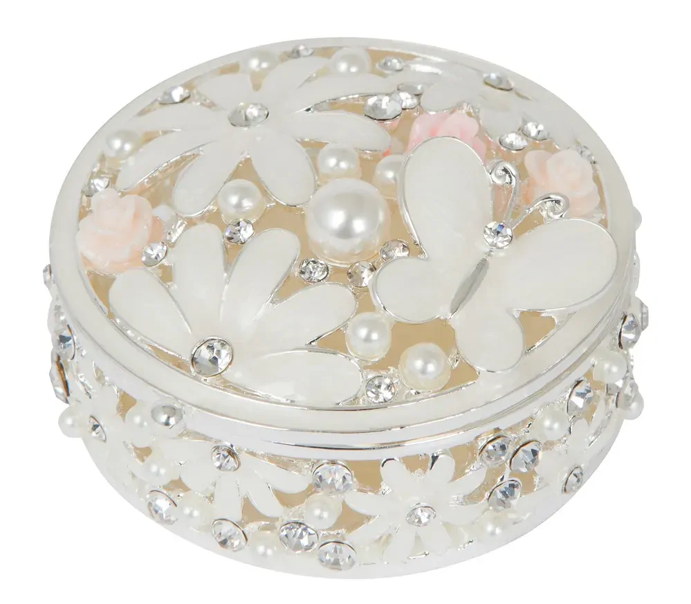 A round trinket box made of epoxy decorated with cream-coloured butterflies, daisies, soft pink roses, diamantes and pearls.