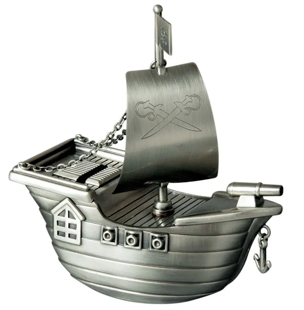A pewter finish money box in the shape of a pirate ship.
