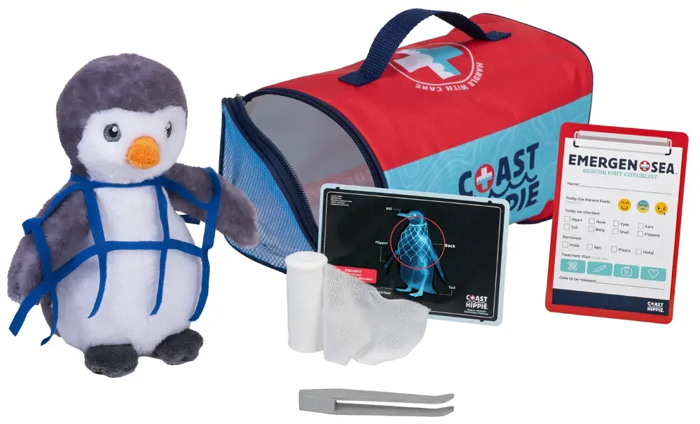 The Coast Hippie Rescue Kit Penguin by Wild Republic turns playtime into a heartwarming wildlife rescue adventure. This adorable Penguin plush needs a caring hero to help it recover and return to the wild. Using the included X-ray and rescue checklist, children can examine their patient, discover what’s wrong, and gently remove obstacles like nets or hooks with the rescue tools. Designed to spark curiosity and compassion, this interactive stuffed animal play set encourages kids to nurture, protect, and care for wildlife while learning about the importance of keeping our planet healthy.