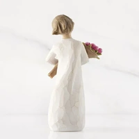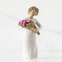This piece features a standing figure in a cream dress holding a large bouquet of bright pink tulips.