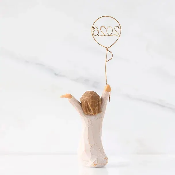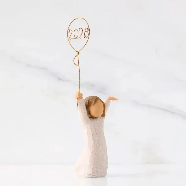 Welcome the new year with excitement and a hopeful heart with this Willow Tree Here's to You 2026 hand painted resin figurine with wire and gold leaf accent. A girl in a cream dress holds up a golden balloon with the year in the center for all to see. This uplifting figurine is the perfect way to add cheer to your home or give to a friend to help them celebrate brand-new possibilities.