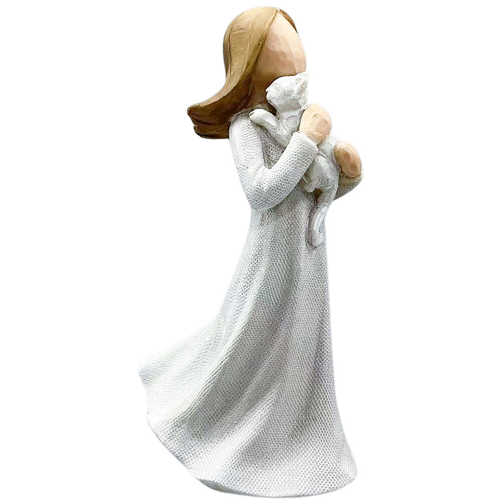 A beautifully crafted resin figure, in white and a natural wooden look texture, depicting the love between a pet and it's owner as the girl holds her kitten close to her chest.