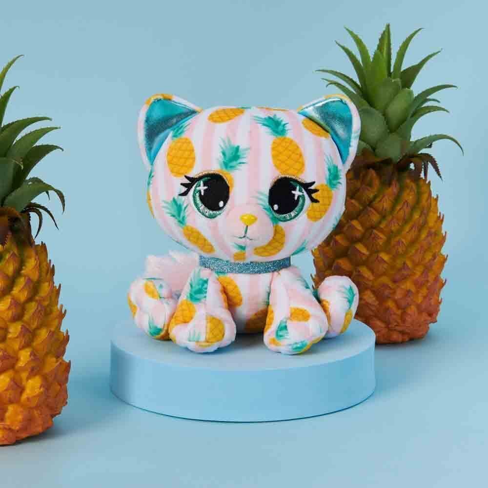 ALOHA DREAMS. Lola DelPina welcomes you with open paws. Part of the P.Lushes Pets Juicy Jam collection, this charming cat smells like the sweet and juicy pineapples from her home in Oahu. She has pink and white stripes with a playful pineapple print and gold eyeshadow that accents her sparkling aquamarine eyes.