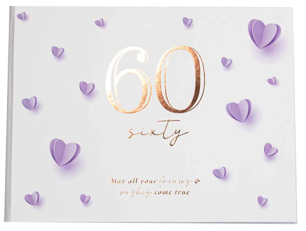 - Hard cover with purple paper heart art, rose gold text that reads "60 / sixty - May all your dreams & wishes come true".