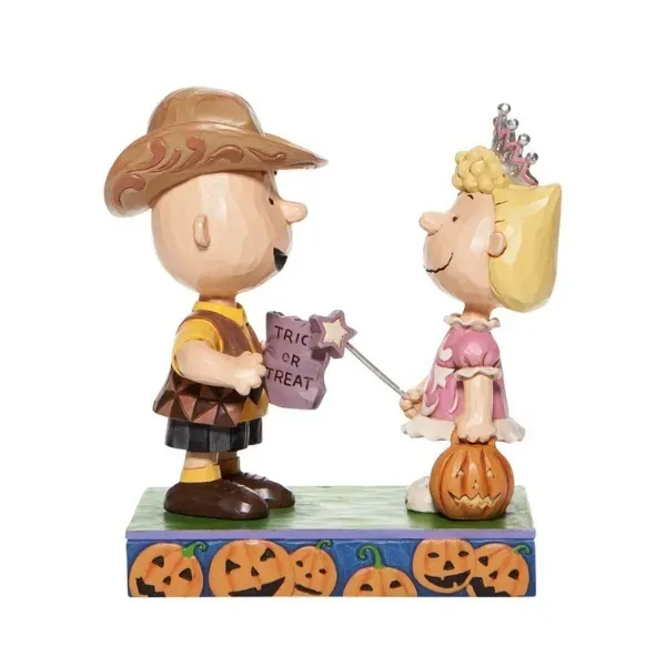 Charlie takes his sister Trick or Treating in this sweet Jim Shore siblings piece. Sally dressed as a princess, urges her brother on while Charlie argues they have enough candy for the night. Seeing his sister smile, he'll likely be out all night!