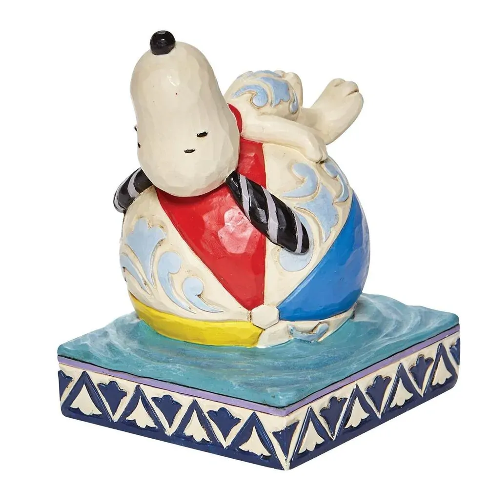 Snoopy, Charlie Brown's lovable yet lazy dog can always be found lounging around. This time he's laying on a colorfully crafted beach ball lined in folksy furnishings designed by Jim Shore. Ridiculously relaxed, the peaceful pup is having a ball.