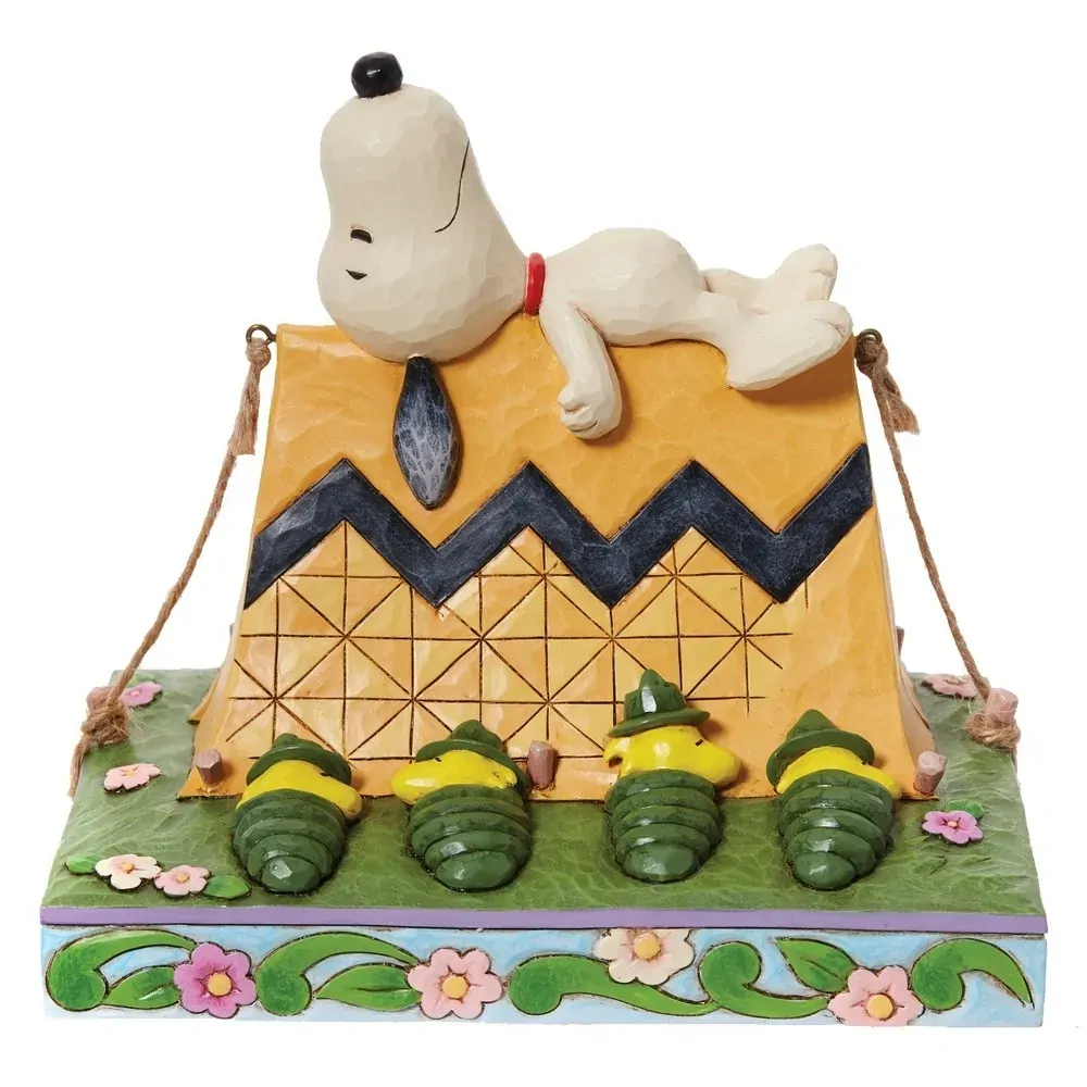 Snoozing at the top of a Charlie Brown zigzag tent, Snoopy enjoys a night in nature under the stars. Taking the camping trip more seriously, Woodstock and company each wear a camp ranger hat from a sleeping bag. Launch into Spring with Jim Shore.
