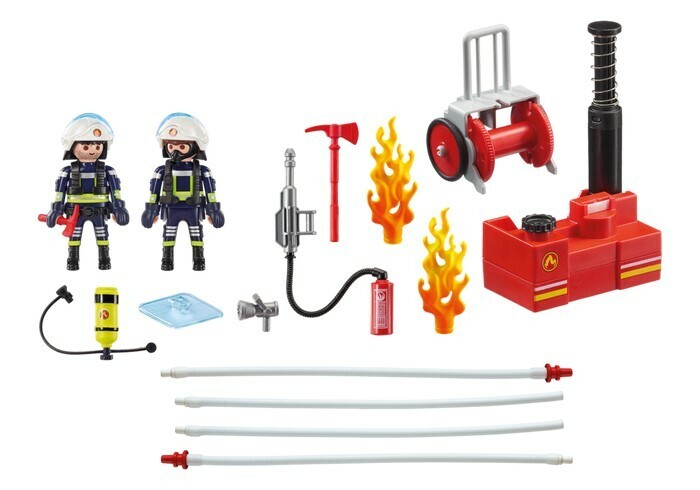 Box contains: Two firefighters, one water pump, one extinguisher, four hose connections, one axe, two flames, one hose reel, one stand, one hose head
