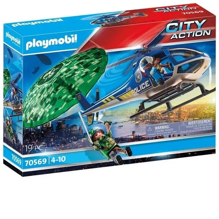 Box contains: Figures: 1 police officer, 1 crook Accessories: 1 police helicopter, 1 parachute, 2 helmets, 1 pistol, 1 holster