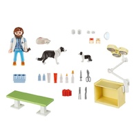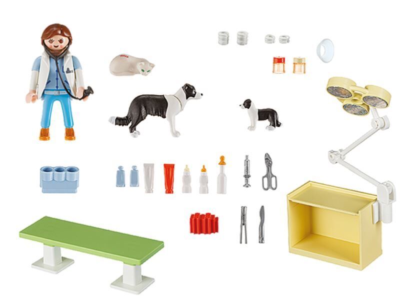 Box contains: one figure, two dogs, one cat, exam table with lamp, stethoscope, medical tools, feeding bottles, medicine, bandages, and tons of other accessories. When playtime is over, simply store the pieces inside the case for next time!