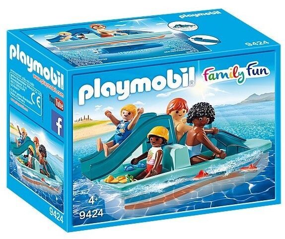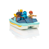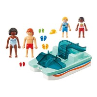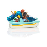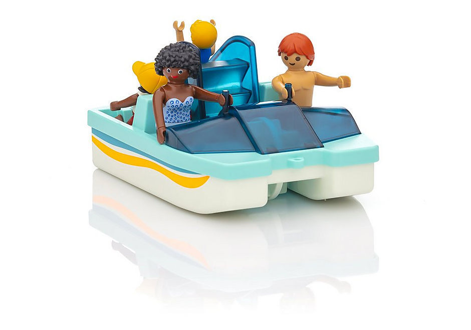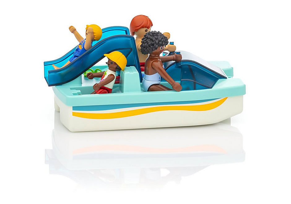 Box contains: Figures: 1 woman, 1 man, 1 boy, 1 girl; Accessories: 1 pedal boat with slide, 4 pairs of slippers, 1 cap.