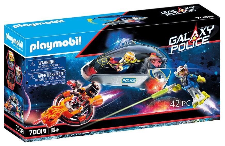 Box contains: Figures: 2 Galaxy Policemen; 1 Galaxy Pirate Accessories: 1 Galaxy Police Glider; 1 Galaxy Pirates Glider; 2 guns green; 1 gun red; 1 energy module; 1 energy stone; 1 connection cable; 1 pair of gloves; 1 white headset with microphone headset; 1 head attachment with visor; 1 helmet; 1 pair of nozzle shoe attachments; 1 pair of shoulder attachments; 1 wrist watch;