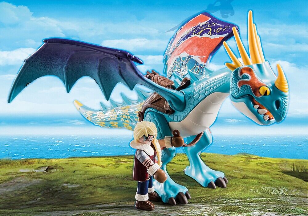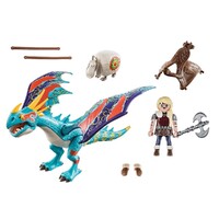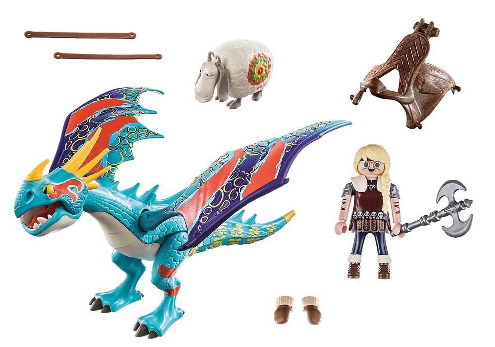 Courageous Astrid and her clever dragon companion Stormfly are inseparable. Stormfly belongs to the dragon species Deadly Nadder and has magnesium-fueled fire bursts, as well as extremely sharp tail spines. Of course, Stormfly would never use these against her friends. In the exciting dragon race, the goal is to be the fastest to catch all the sheep. In their cool blue and red racing look, Astrid and Stormfly not only look fantastic, but also are lightning fast. This duo gets along blindly! The playset includes Astrid and her dragon lady Stormfly in their racing outfits, a tossing sheep, a double axe and other cool extras. Astrid can ride Stormfly. The saddle is removable.