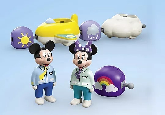Set includes 1 Mickey Mouse figure, 1 Minnie Mouse figure, 1 airplane, 1 cloud vehicle, 3 plug-in elements to attach