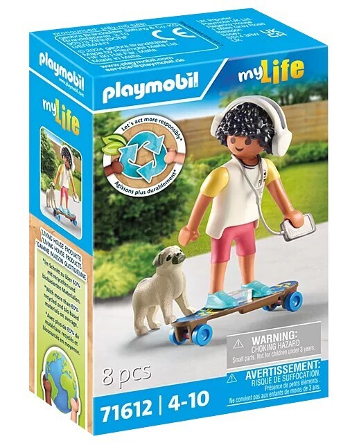 Whether skateboarding or going for a walk, the dog is always by his friend's side! Lovingly designed PLAYMOBIL playset featuring one PLAYMOBIL figure, a dog, and a skateboard for creative role-playing.