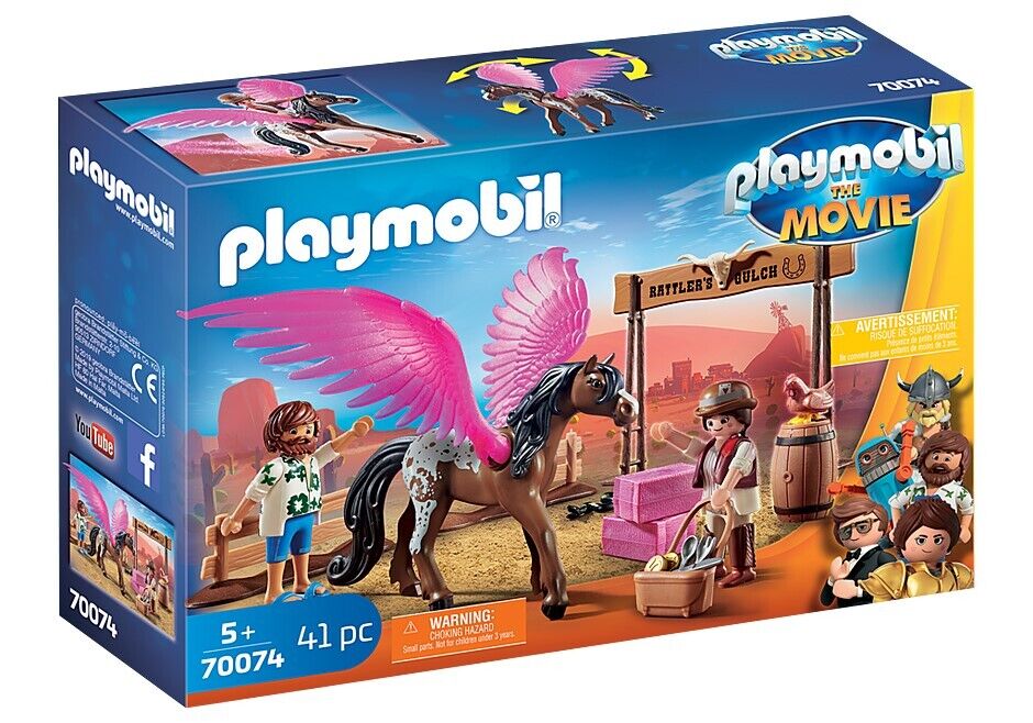 PLAYMOBIL: The Movie© is the first animated film inspired by the imaginative world of PLAYMOBIL® and takes the audience on an epic, funny and unforgettable adventure. Matching the cinema launch, there are nine cool game sets around the PLAYMOBIL® film.The play set contains the movie characters Marla in western outfit, Del and a pink-winged Flying Horse, as well as a chicken, magical hay, a fence and many other accessories