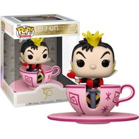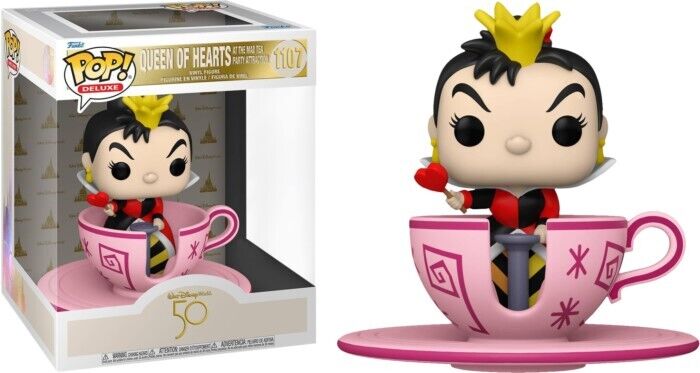 A 50th Anniversary edition of the Queen of Hearts from Alice in Wonderland riding in a teacup at Disneyland.