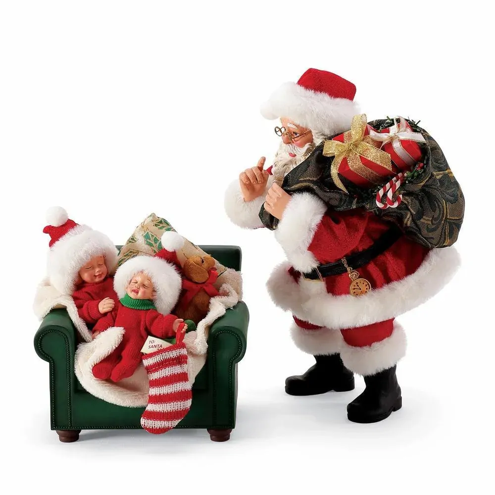 The kids fell asleep waiting for Santa, but puppy woke up and is about to bark! This Clothtique fabric and mixed media piece is full of details including a pocket watch on Santa's belt.