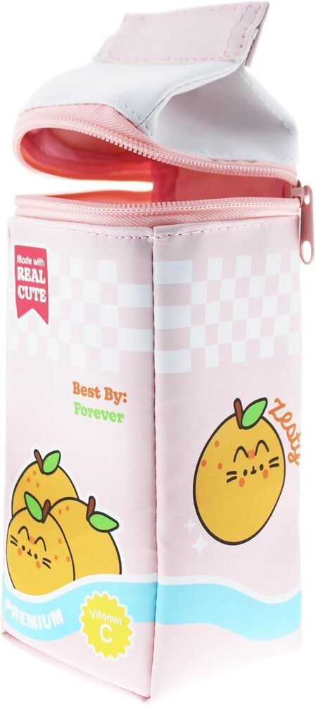 The Pusheen Fruit Juice Carton Pencil Case – a playful and novel addition to your stationery! Designed in vibrant pink and shaped like a fruity drink carton, it stars Pusheen as adorable oranges, boasting the label "Premium" and "Vitamin C". Made from matte PU, this case adds a splash of fun to your desk setup!
