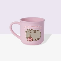 Sip in style with Pusheen! This cute double-sided mug features an adorable illustration of Pusheen with a steaming cup of hot coffee with text reading 'Good morning'.