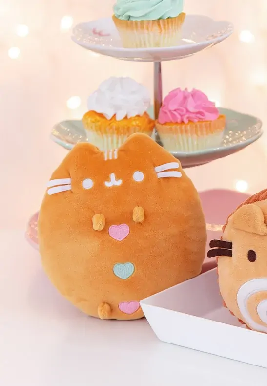 -Features Pusheen as a tasty cookie with brown plush, white facial details, and a set of pink/green pastel heart buttons