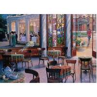 Showcasing a scene of a fancy cafe with stained glass windows, a painting of an Edwardian dinner party and open glass doors that show a woman holding a bouquet of flowers outside, this jigsaw transports you to a charming European setting. It's crafted with Ravensburger's premium materials including glare-free linen paper, providing an immersive and rewarding puzzling experience that - thanks to the durable cardboard base - will have your returning to re-assemble it again and again.