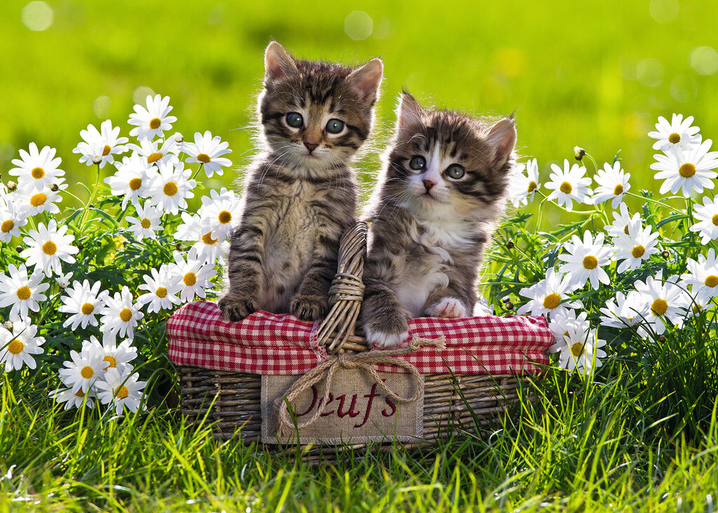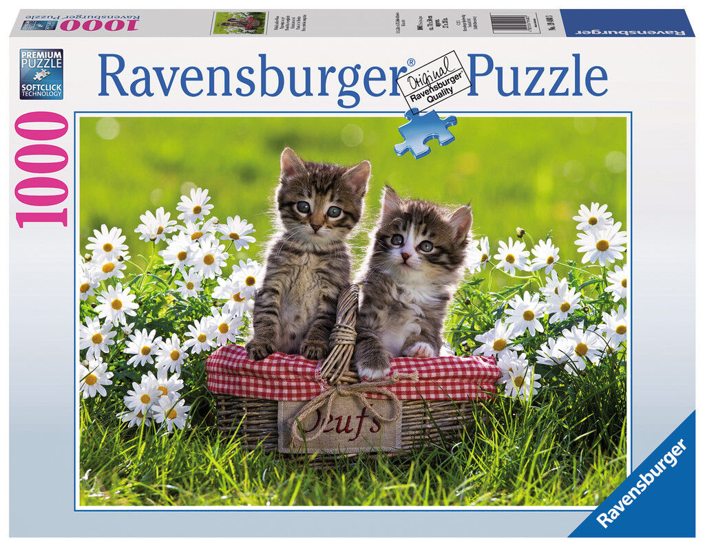 Featuring two precious kittens nestled in a picnic basket among a field of blooming daisies, this 1000-piece jigsaw will provide hours of relaxation and satisfying fun. Ravensburger's renowned quality makes the imagery blissfully glare-free and guaranteed to last repeated play, so you can enjoy the sense of accomplishment from assembling the sweet scene depicted in this jigsaw again and again.