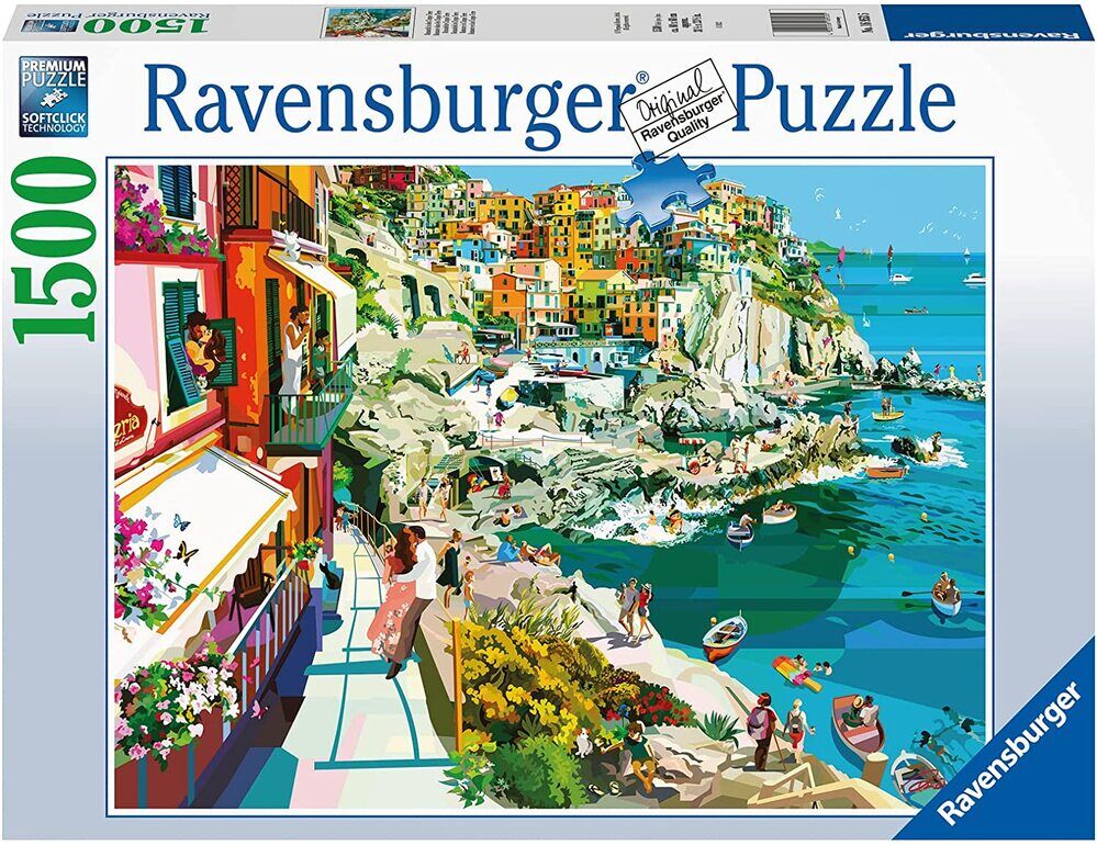 Escape to the Cinque Terre with this 1000-piece puzzle by Ravensburger, featuring artwork by Pierpaolo Rovero.