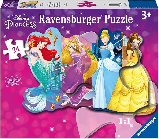 Enjoy piecing together this fun shaped 24-piece floor puzzle, featuring Disney Princesses Ariel, Rapunzel, Cinderella and Belle.