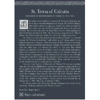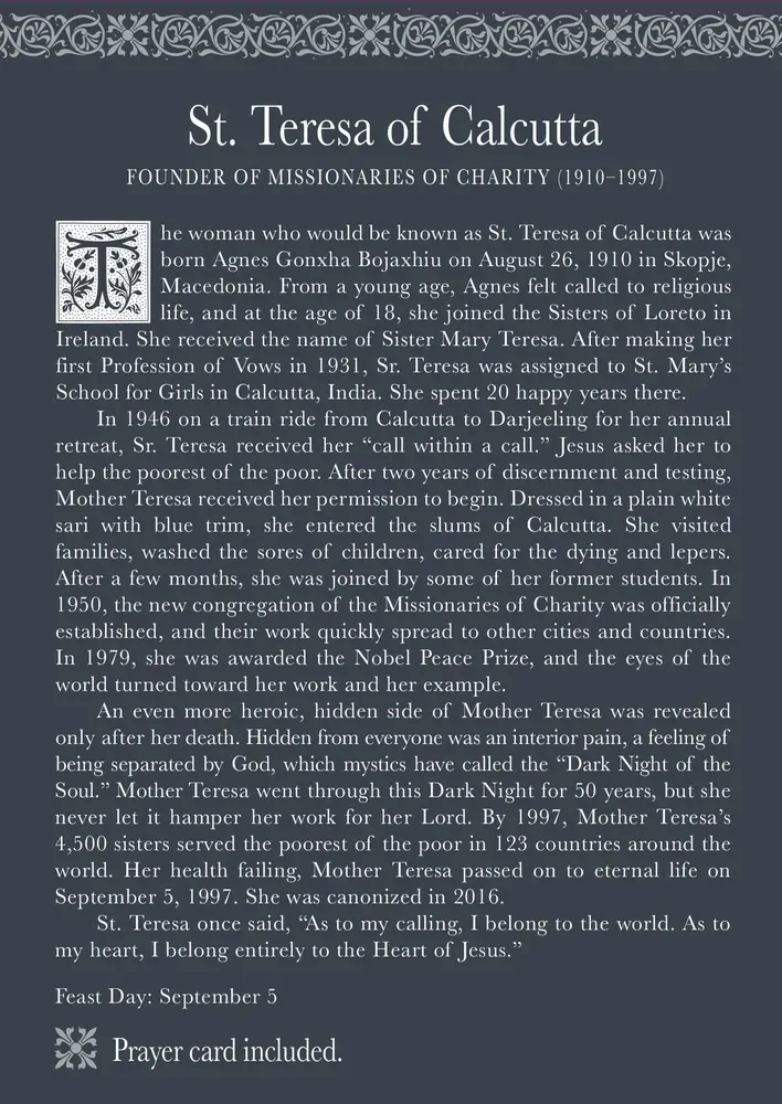 God, our loving Father, You have given us a beautiful example of love in action through Your daughter, Saint Teresa. In her life, she showed us how to follow Jesus by loving and serving others. She joyfully fed the hungry, rallied for the poor and unwanted, cared for the sick and dying, and sheltered the homeless. May we imitate her love and generosity by reaching out to Your needy ones. Thank You for the gift of Saint Teresa. May she now rest in Your arms eternally. Amen."